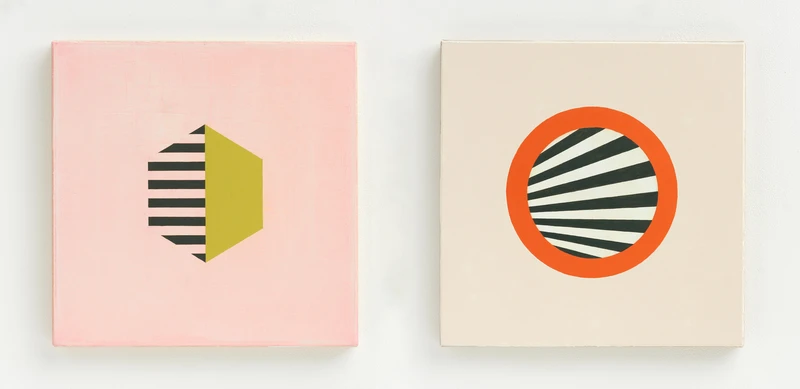 Expanding on the distinctive geometric abstract paintings she is known for, Turnbull has been exploring a new way of working. Resisting waste in the studio, Turnbull has for years saved canvas and linen offcuts. Towards the end of last year, she gathered what she had—prepared and unprimed pieces alike—and ordered simple wooden stretchers for each. The result was a set of 27 small, irregularly sized rectangular canvases, which she began to work on, making small paintings with each new work responding to the previous one.
