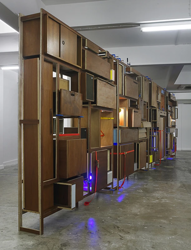 In This Was Tomorrow, Michael Samuels further investigates sculptural structures, addressing formal, material and spatial qualities. He continues to utilise Modernist furniture, most commonly G-plan which he breaks down before rebuilding in a spontaneous manner. This process heightens the tension between the intended function of the objects and their immaterial value. Samuels will be in conversation from 4pm with Mark Waugh, past director of A Foundation and chair of Spacex board of trustees.