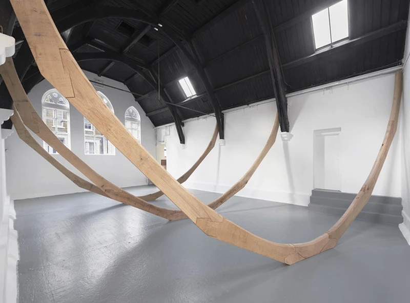 Alexandra Bircken presents a new site–specific sculptural intervention, taking the gallery’s vaulted ceiling as its central formal concern. Bircken reimagines this distinctive structure as a cavernous, upturned ship’s hull. Working with craftsmen to replicate ship building methods, Bircken has constructed three imposing bowed beams. Traversing the gallery space, these beams intersect with the building to create a spiral of arches. Concise and austere, this new work echoes the shell–like carcass of a boat with a deceptively simple gesture that capsizes the architecture of the gallery.