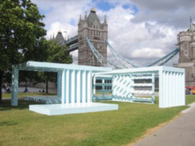 At Potter's Fields Park, Southwark. Inspired by the language of Modernist architecture, this modular pavilion will introduce an new feature into the multifaceted landscape of the Southbank.