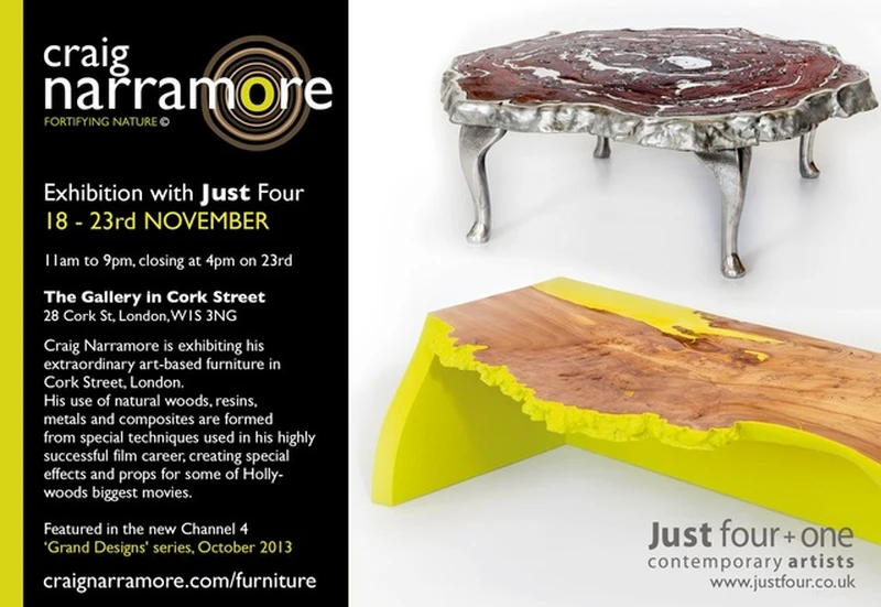 Craig Narramore is exhibiting his extraordinary art-based furniture in Cork Street, London. His use of natural woods, resins, metals and composites are formed from special techniques used in his highly successful film career, creating special effects and props for some of Hollywood's biggest movies. http://www.craignarramore.com