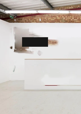 The final work in the virtual rendering of the show is the ‘digital intervention’ Scheer has created in response to both the works selected for the show but also the physical exhibition space of Annka Kultys Gallery itself. The digital intervention appears on the west wall in the virtual renderings. Scheer used his experience of creating the virtual renderings of the exhibition space in Photoshop and the serendipitous suggestion from Google that ‘Commercial Building’ was a possible related search in response to his Reverse Image series’ work _Ruby City in Texas revealed…to create what he has coined as a digital intervention in the virtual gallery space. The realised digital image thus fuses elements from the gallery’s appearance, such as the exposed brickwork, the green light of the EXIT sign above the door and the gallery’s white walls and grey concrete floor, with references to works exhibited in Please enter TITLE here to create a work that presently exists only within the digital confines of the virtual gallery renderings.
