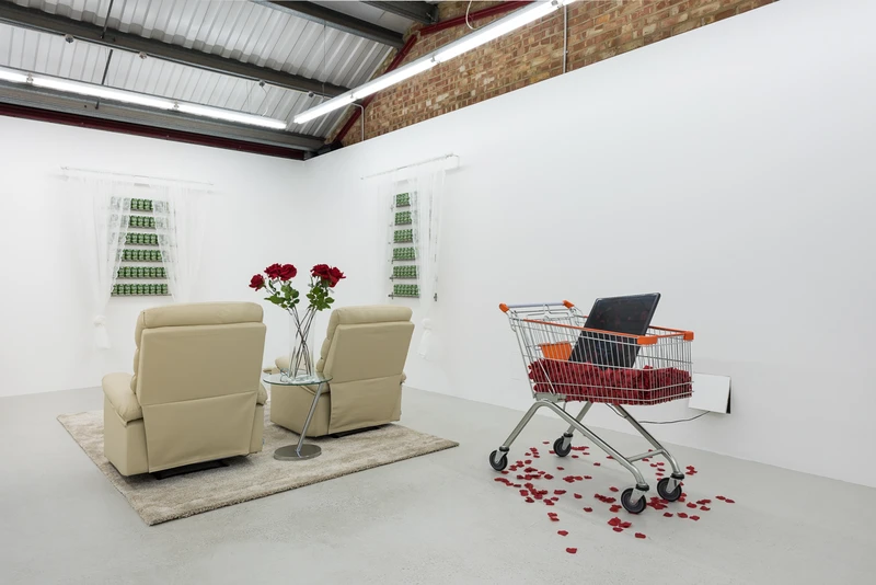 The windows are complemented in the gallery by two video pieces by the artist: 'The Perfect Human' and 'Self-service'. 'Self-service' features the computer-generated voice of an automated supermarket self-checkout, overlaying images of rose petals floating in air around a rotating shopping trolley. The saccharine petals romanticise what has now become the anonymous and choreographed experience of contemporary grocery shopping, while simultaneously fostering a nostalgia for a not forgotten near-past when buying groceries implied idle chit-chat with a real check-out operator.