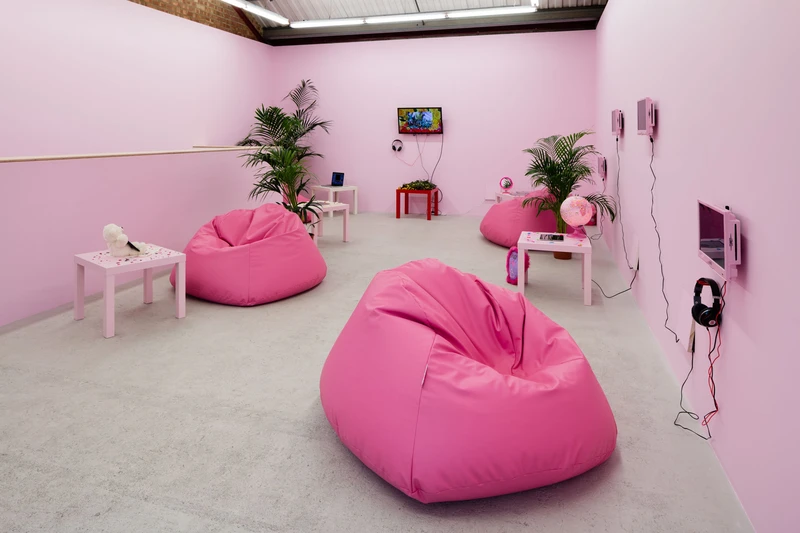 To foster an ambience akin to the artist’s own bedroom in Detroit, the normal white cube aesthetic of the gallery space has been transformed: its walls have been painted a pink similar to that of Soda’s bedroom and its space decorated with pink-hued furniture pieces which have the dual function of both providing gallery visitors with a physically comfortable environment in which to view the work, while also replicating the ‘girly-pink-warm’ atmosphere associated with the artist’s work.