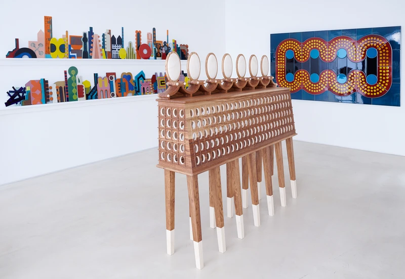Lubna Chowdhary (b.1964, Tanzania) is highly acclaimed for her ceramic works, which subvert the traditional context and utility of the medium to address a longstanding preoccupation with urbanisation and material culture. Her sculptural practice has evolved from a sustained fascination with the fusion of binary cultural and artistic influences. Her newly produced work for PEER, including wall-, floor- and plinth-based pieces also traverse material, application, and process. A range of ceramic pieces – multi-part panels and arranged Tableaux – combine industrial manufacturing technology such as water-jet cutting with highly developed hand-applied glaze techniques. These colourful and exquisitely executed works are presented alongside a selection of small, hand-built un-glazed sculptures. Chowdhary will also exhibit work in a range of new materials, which she has more recently started to work with. Three large wooden sculptures have been developed, which combine CNC (Computerised Numerical Control) with traditional craft skills, while two other works have been created in situ from easily obtainable and inexpensive industrial components and materials.