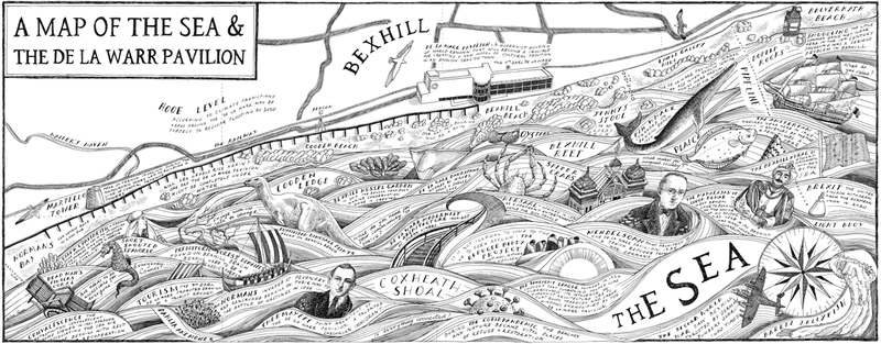 Cann’s drawing depicts the Pavilion facing a swirling sea of historic events and figures, current desires, provocations and predictions, and maritime details. Queen Cynethryth of 8th Century Mercia, the Pavilion’s architects, and the Maharajah of Cooch Behar, drift amongst spider crabs, sandbanks, the wreck of the Amsterdam, and a dinosaur whose footprints from the Mesozoic era were found on Bexhill beach. Ebbing and flowing throughout are comments and questions shared at community events, about how the Pavilion can collaborate with publics towards the creation of a more equitable, environmentally sustainable society.