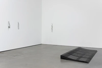 A series of sculptures occupy the gallery at varying heights and scales, yet their proportions and configurations are vaguely familiar. As we enter, a polished handrail protrudes and subtly prompts us around a corner. In Canopy, a shelter of grey glass hangs overhead. These aren’t quite objects of use or architecture. There is an element of tableau, an assemblage in space to be inhabited. Steel rods dissect the room, allocating and apportioning the floor and the air for person and object, providing stances, stands and stature.