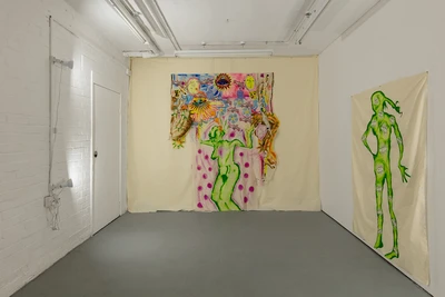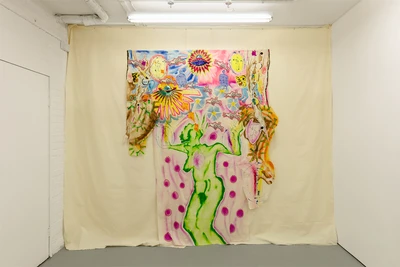 The ground floor gallery is also transformed into a three-dimensional canvas in which paintings on fabric, displayed on layers of calico, create a sort of textile-based mise-en-abyme. Figures like the clown in Love N Bullets Revisited (2021) evoke the ambiguity of a character that is both entertaining and evil. In Harvest Moon (2021), a helicopter – symbolising the increased surveillance apparatus that has invaded British society – hovers above a black rabbit running on a full moon night.