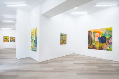 Influenced by the Fauvist style and 19th-century romanticism, Taylor’s paintings use colour unashamedly to draw an emotive response. His strident chromatic combinations begin on the floor with an eye-dropper. Dotting a mix of primary and fluorescent colours onto a wet canvas, he then rotates the canvas, allowing forms to appear. These nascent shapes become entry points and guides, as Taylor applies more deliberate marks and gestural brushwork. Abstract shapes and contours of rocks, mountains, rivers and shorelines emerge as Taylor forges new places to become both painter and Creator.
