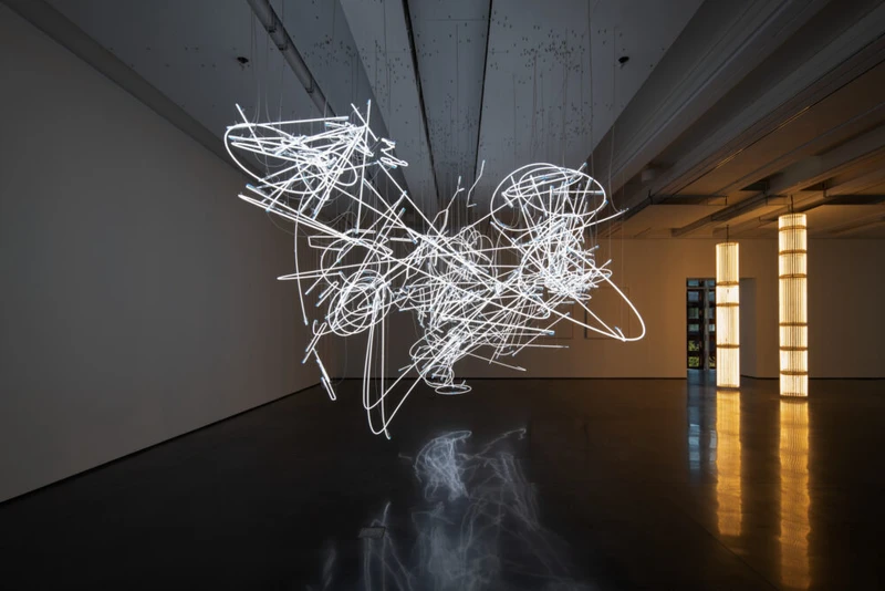 Intricate neon sculptures interrogate the means of perception and question how we interpret the works and their spatial surroundings which are used to construct meaning. The visual assemblage presented in concert throughout the galleries unfolds in a sort of ‘controlled randomness’, in which artworks coexist in a play of exchanges between intervals and intensities. Neon works are suspended and isolated in space, seven-metre high light columns descend from the ceiling like a subliminal forest of thought, suspended windscreens are mobile, and transparent glass panes reverberate with a soundtrack defined by relations constantly in flux.