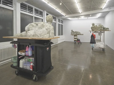 The three sculptures in the main gallery space renegotiate the reclining female, a motif inscribed in our cultural memory which has been depicted predominantly by male artists throughout art history. Wermers situates her lounging plaster figures upon modified maintenance carts. These objects from everyday life, used primarily in public areas, relate the working body to the architecture of narrow hotel corridors, airport lounges, and office buildings. Designed to make service work more efficient, they stock a multitude of cleaning products and supplies of linen and toiletries. In Wermers’ compositions, the carts function as pedestals on top of which the monolithic figures stretch out, symbolising the pause or break from work undertaken by the female body. Moulded from plaster applied generously on carved Styrofoam cores, the just over life-sized women lie in various positions of repose, with the coarse surfaces revealing the artist’s hand. Reclining Females #1–3 rest at eye level or at a vantage point looking down onto the viewer and into the exhibition space. In contrast, earlier bronze sculptures of the canon (for instance, those by Hans Josephson) are placed close to the floor on low plinths, and are looked down upon. Wermers’ figures thus claim a position of power and agency not afforded to most of their historic predecessors nor contemporary maintenance workers.