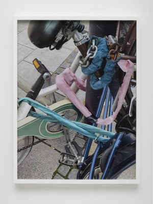 Following the recent reconfiguration of the gallery layout, Wermers has used the new front room as a lobby or antechamber by featuring a suite of photographs of locked bicycles, documenting an action often performed before entering a space. The prints closely frame entanglements of bicycles, chains, bolts, and wires in vibrant hues, set against grey grounds of roads and pavements. The clasps attach the vehicles onto various infrastructural elements including plastic construction barriers, streetlights, traffic signs, and the Art Nouveau entrances of Parisian metro stations, as well as to each other. This series continues Wermers’ ongoing interest in bicycle racks as sites for urban negotiations of material and public space, and follow seminal works inspired by the same subject such as the monumental outdoor sculpture Emscher Folly (2022) installed in Duisburg, Germany. A number of the images have been digitally collaged, echoing the act of attachment carried out by the locks and further complicating the already messy accumulations of colours, shapes, and ownership. Some of the slouching, amorphous devices resemble umbilical cords or intestines, enveloping the straight lines of the steel objects with an organic, corporeal component and underlining the city’s analogies to a body, with its own interconnected systems of circulation and support.