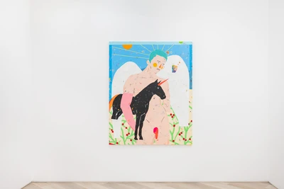 So you see, I cannot help but create stories behind and as a method to talk about Baik’s work. In fact, I feel invited to do so. His previous collection included a gender-and-race-swapped Leda and the Swan, boys with coloured phalluses riding atop unicorns, polka-dot skies, and dozens upon dozens of imaginary birds. At times it all feels a bit trippy, a bit macabre: the psychedelic tunnel wherein Gene Wilder’s Willy Wonka scarred generations of children or C.S. Lewis’ first Narnia book where the flamboyant (and definitely gay-coded) titular magician takes his nephew to fantasy lands through iridescent shimmering ponds, reached in the attic of the house. These images are nostalgic: they immediately evoke not just a memory but a reaction, and that’s precisely why I allude to them. They are also very, very Baik.