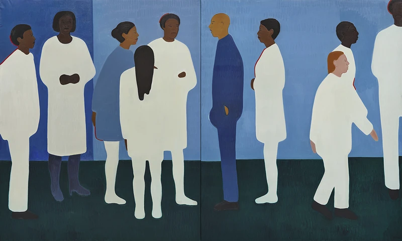 The paintings recall ordinary social rituals, yet Longe imbues these scenes with discomfiting, uncanny abstract forms that allude to contemporary urban tensions. In Police Man (2023), a large-scale dipytch, ghostly silhouettes confront a blue-suited London police officer. As in many of Longe’s works, figures gaze past one another as if unaware of the presence of others, their blank expressions, bell-shaped coats and dresses, and frieze-like arrangement conspiring to distance them from the viewer.