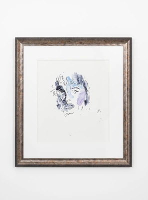 The exhibition at ANNKA KULTYS GALLERY features six limited editions of Ai-Da’s work. These range across scale and typology, from her early abstract paintings to her more recent self- portraits. As such, the exhibition is a testament to Ai-Da’s ever-evolving skillset and underscore her vital contribution to the advancing discourse around art and technology. Self potrait – Loucin (2023) is the largest work on show. Complemented by an elegant black frame, the self-portrait features dreamy washes of baby pink and light blue, with Ai-Da’s unmistakable image front and center. Self portrait—Aspicco (2023) presents Ai-Da’s likewise presents recognizeable profile in thick and expressive strokes, this time outlined in a radiant pistachio hue. Self Portrait — Cuaen (2023) is perhaps the most unique work on show. It could be likened to a quick pen and ink sketch, with Ai-Da’s curious gaze complemented by watercolor-like splotches of cool blue, soft lilac, and charcoal.