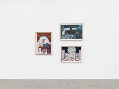 This exhibition spans over 30 years of Sjöö’s practice from 1976 up to 2003, showcasing both her paintings on canvas and paper. It reveals the artist’s sources of inspiration including pre-Aztec and monumental Aztec sculptures, Catholic art and the vibrant revolutionary paintings by artists including Diego Rivera and Frida Kahlo. The titles of Sjöö’s work in the exhibition – including Women Becoming (1976), Child of the Mother-tree (1984) and Priestess at Tarxien Temple on Malta (2003) – indicate the consistency and range of her concerns: feminism and spiritualism. Cornwall, Ancient Land of the Goddess (1993) depicts a landscape populated with stones and enigmatic characters amidst green fields, tempered with colours that evoke the sea and that possibly allude to the blood spilled for deeply held beliefs. In Sun Goddess at Stonehenge (1992) the famous giant stones are pictured beneath a floating mask, a gateway to a glowing, labyrinthine womb that shelters an embryo. Continuing the theme of the countryside as a place of profound mystery, Sjöö explained that her chosen landscapes are ‘full of spirits and the haunt of the powerful and most ancient…’