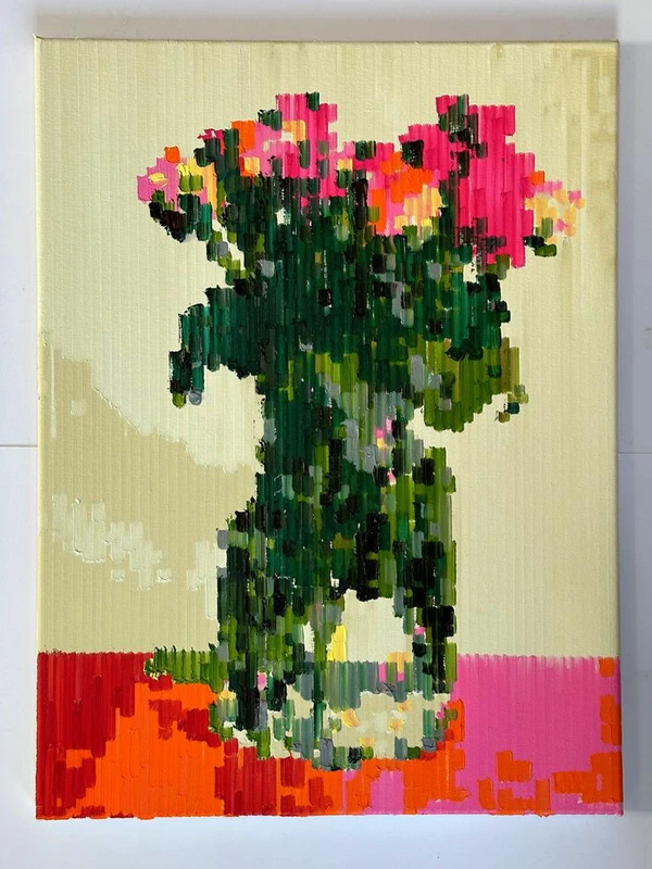 Andee Collard’s new series of twenty floral still-life machine paintings (2022-2024) and three portraits of Walter Benjamin make up the largest part of the exhibition, each painting is created using digital code and an automated machine assembled and modified by the artist.