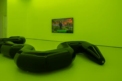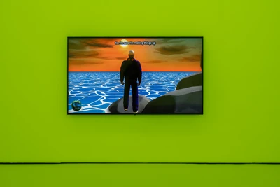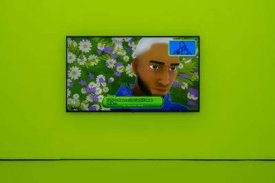 La Potion (EH) (2023), Sara Sadik’s elegiac work of video art commences with a narrator who introduces a new video game and like us, is looking at the ‘gameplay’ for the first time. However, this game features an avatar of himself. Stressed and anxious the avatar sets out on a walk looking for light and healing: “We will seek happiness since it does not come to us.” Like a magic drink, La Potion takes the narrator/avatar on a journey to find a way to feel better. Imagining constellations in the sky, walking through a beautiful garden, jumping towards the sea and swimming beneath the waves he feels soothed and calmed.