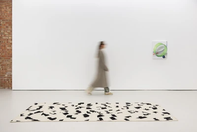 The carpets’ pattern refers to the Jacquard Loom invented by Joseph-Marie Jacquard, a French weaver and merchant, in 1804. Not only did it transform patterned cloth production but it also represented a revolution in human-machine interaction in its use of binary code punch cards with a punched hole or no punched hole – to instruct a machine (the loom) to carry out an automated process (weaving). The Jacquard machines were an important conceptual precursor to the development of computer programming and data entry, used by the computer pioneer Charles Babbage to store programs in his Analytical Engine.