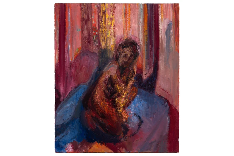 Jai Chuhan's vibrant paintings depict the human body in abstracted room-like spaces. Using vivid cadmium pigments, Chuhan's visceral visual language incorporates contorted limbs, raw flesh and quivering muscle to suggest bodies in struggle or in intimate embrace. Her familiar motifs of the birthing body, brides in Indian wedding ceremonies and the dancer are captured through smudged caresses and violent gestures. These ambiguously gendered figures initially appear in a private world and yet their architectural surroundings act as if a stage for viewing. Working from life, photographs and personal memories, Chuhan’s paintings reconsider notions of voyeurism, eroticism, race and the gaze.