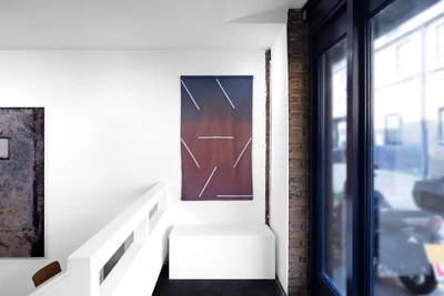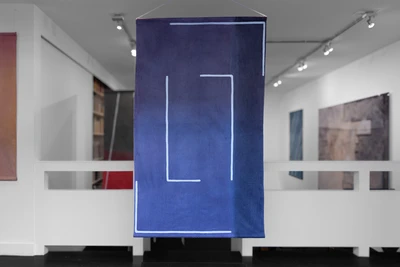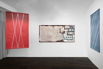 Felipe Mujica, a Chilean artist, exhibits textile pieces created during his 2019 residency in Isla Mancarrón, Nicaragua. Developed collaboratively with local artisans, Mujica’s hanging “curtains” incorporate hand-dyed fabrics and geometric motifs painted with island craftspeople. These fabric works function as spatial interventions and social artefacts, highlighting Mujica's ongoing exploration of geometric abstraction and participatory art practices, often rooted in local traditions.