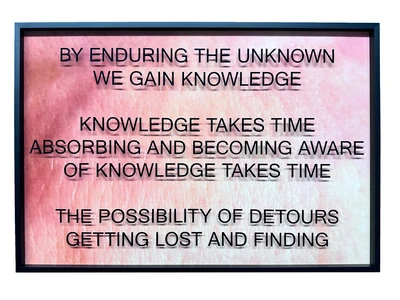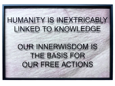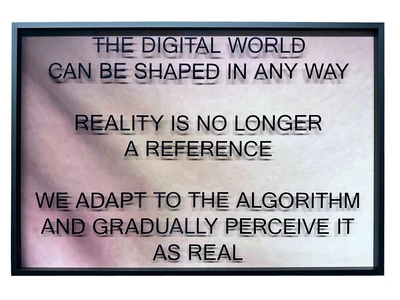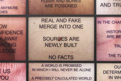 It’s a new body of work. The work extends over about 115 frames. The frames contain close-ups of my body. Text is lasered onto the glass of the frames. The content is about the loss of our true knowledge, through algorithms and the generation of texts and the manipulation of news, our facts become more blurred than ever before, in addition there are fake facts that also burn themselves in, are regenerated again and again, the AI continue to generate texts from themselves and thus blur the knowledge.
