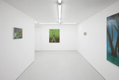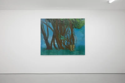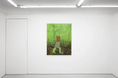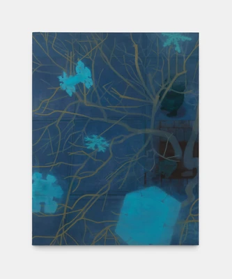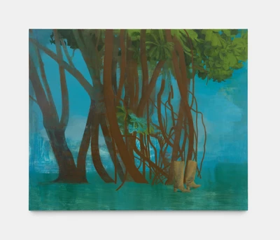 Alongside these domestic and exterior meditations, Yao engages with objects that carry humour, desire, and social resonance. In ‘Currently Trending’ (2025), a series of paintings centred on shoes and stencilled fashion motifs, black shoulder bags and boots rise against the forms of tree branches, their glossy surfaces colliding with gestural natural forms. These works explore consumer culture and gendered aspiration with a quiet irony: they are at once alluring and absurd, fetishised yet exposed, playful yet critically aware.