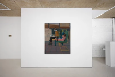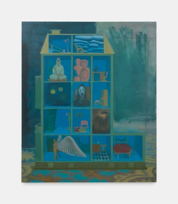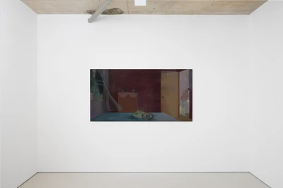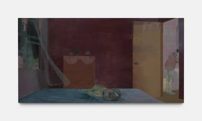 The hushed, reflective quality of Yao’s interiors recalls Vilhelm Hammershøi, whose restrained palette and meditative spaces imbue silence with weight. Yet Yao’s rooms are permeable, occupying a space between observation and recollection, where paint texture carries the blurring of memories. In ‘Crying with My Student’ (2024), the dripping paintings on the background cabinets, the overlapping shadows, and the pastel pink hue spreading across the floor from the clothes of a crying child together create a dreamlike effect. The artist recalls, “She was crying and then it made me cry. We had this connection between us and we were complete strangers. I don't teach her and we had so much difference, but it was incredible that we could have this moment.”