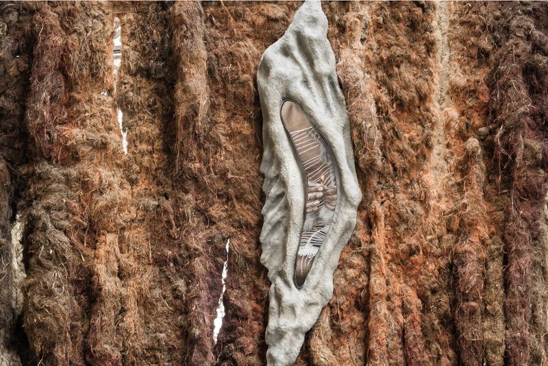 Conceived as part-stage, part-laboratory, the artist presents an immersive installation that incorporates her signature photorealist embroideries with large-scale sculpture, textile works and living mycelium fungus elements. Cultivated in her studio over several months, this is the first time the artist has worked with fungus as a medium, and parts of the surface will continue to evolve throughout the exhibition.
