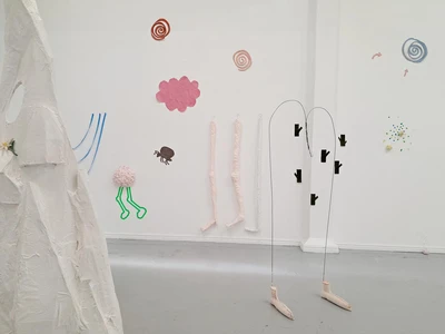 Between the Floor and the Wall presents the work of seven artists whose work oscillates between the flat and the fat, two and three dimensions, drawing and object, the horizontal and the vertical. Their work comes from different (although sometimes overlapping) conceptual and narrative starting points, but all share a concern with an in-between place, of shifting and transmutation, where meaning is difficult to pin down. The show includes sculptures and installations that move between floor wall and ceiling. Between the floor and the wall is curated by Eleanor Bedlow, Janet Currier and Jane Millar.
