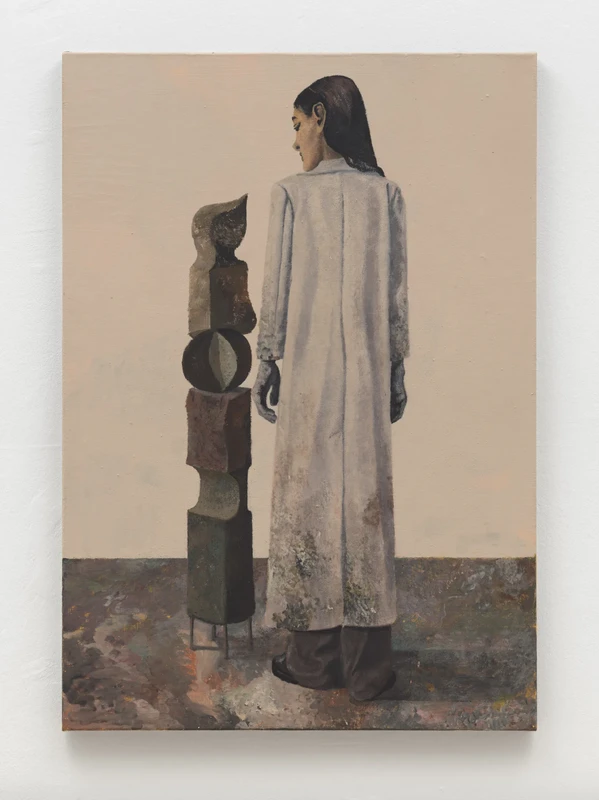 Threaded among these strands are other figures: a dancer pivoting against a grey ground, a woman in a white coat gazing at a sculpture. They extend the exhibition’s atmosphere of going on despite dim light. Even destruction carries its afterlife - one painting shows a broken vase spilling petals under a field of gold, shards scattered but glowing. Another depicts a woman calmly burning what might be a drawing, a letter, or a photograph, as if discarding failure could itself become an act of making.
