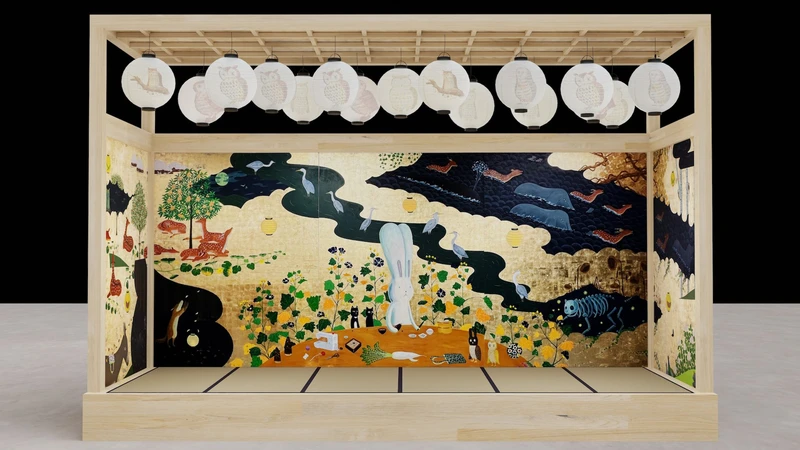 Atsushi Kaga fuses elements from animé and manga with the work of painters from Hasegawa Tōhaku (1539-1610), Itō Jakuchū (1716–1800) and Ogata Korin (1658–1716) to James McNeill Whistler (1834-1903) and Henry Darger (1892-1973). Throughout the work Kaga uses gold leaf, taking inspiration from the Edo period Rinpa School of painting in Kyoto, known for using gilded layers of oil and gold to exalt themes inspired by nature and Japanese traditions.