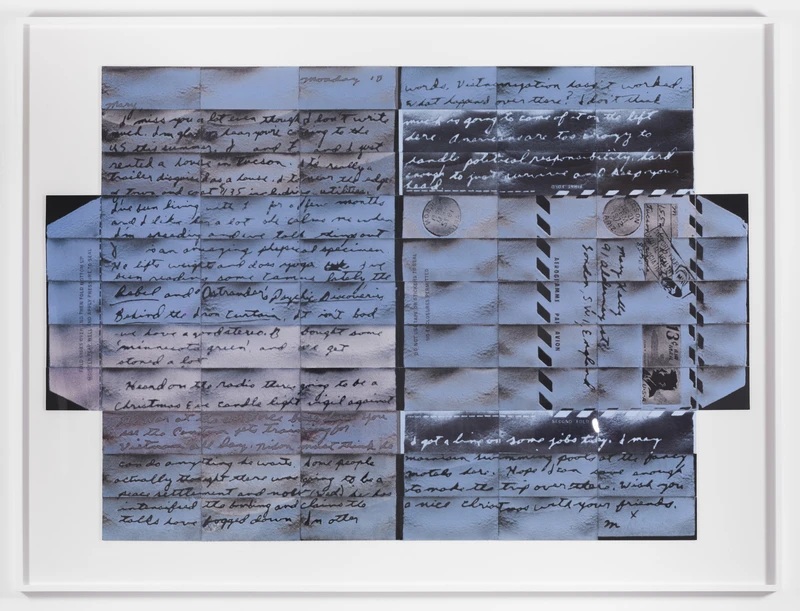In her work, Kelly asks what defines an era, and for whom, not only as political discourse, but also as trace or residue of the personal lives that were defined by it. News from Home comprises three letters from Kelly’s archive, dating from her time living in London in the 1970s. Two examples from the series are on view: London 1974 gives a fleeting glimpse of communal living – women negotiating their commitment to activism with childcare, illness, accidents and domesticity – while Tucson 1972 addresses economic survival, alternative ways of living and political protest in the context of an escalating war in Vietnam. Likewise, two intimately scaled works, the covers of Life, April 1945 (2014), documenting the aftermath of the atomic bomb, and Shrew, December, 1970 (2017), connecting global conflict and feminist action, are subjects that still resonate today.
