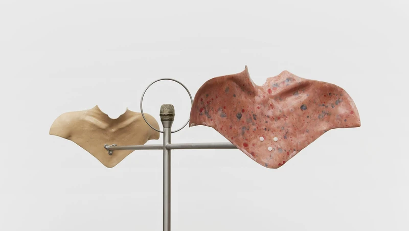 Her sculptures merge the anatomical and the industrial. Glazed ceramic fragments, pressed and moulded against her own body, are placed in conversation with fabricated metal elements, held together by hardware such as clasps, wingnuts and springs.