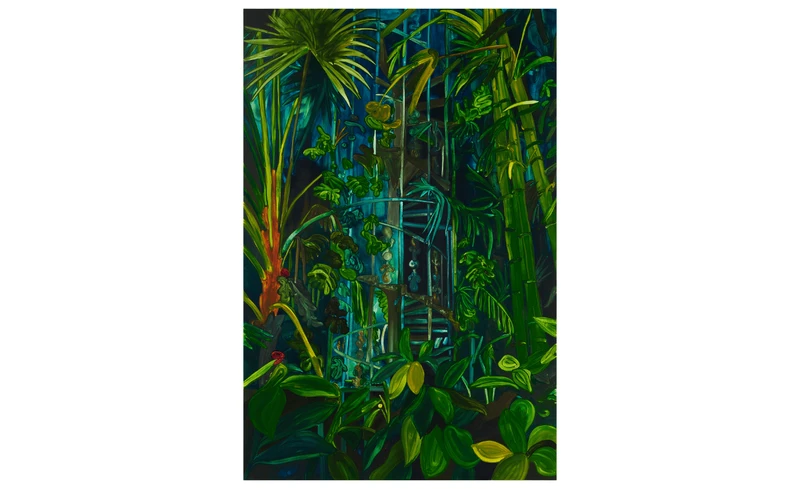 Under The Dome (2024), one of the biggest works in the show, draws its composition from a photo Woods took of the iconic Temperate House at Kew Gardens, London. In this scene, the viewer is positioned amongst the luscious tropical plants, peering up at the spiralling Victorian staircase. This glasshouse provides a sanctuary for some of the world’s rarest and most threatened plants. Woods became fascinated by this manmade ecosystem and how it protects flora that otherwise could not survive the UK’s cold climate. Here, the elaborate glass structure becomes a metaphor for the thin veneer between life and death.