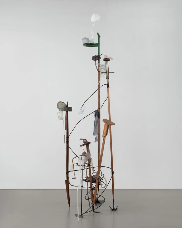 The installations, paintings and sculptures explore complex family dynamics through the transience of raw silk, and durability of wood and aerospace aluminium. Hu sources both organic and inorganic materials which are considered waste products, such as baby teeth, scrap pieces from urban demolitions and obsolete domestic objects. These overlooked, defunct materials each have their own lifespan and are revived through her sensitive arrangements. Hu contextualises this temporal collapse through the title of the show in bringing together two Ancient Chinese symbols: the Mayfly – a short-lived insect representing impermanence – and the Lilac Knot – a cold-weather resistant flower, native to the artist’s hometown of Harbin, signifying endurance and the perplexity of human desire.