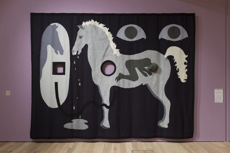 Material Worlds: Contemporary Artists and Textiles explores how artists are using textiles in surprising and radical ways. Illuminating the diverse roles textiles play in contemporary artistic practice, the exhibition brings together artists who take the intimate, everyday and domestic quality of textiles and transform them into theatrical, bold, unsettling and humorous artworks that create worlds and tell stories ranging from the personal to the cosmic.