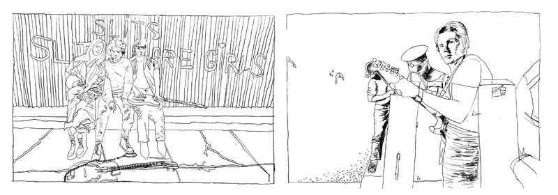 Angela Ferreira: Drawing of National Wake, 2025. Based on a photograph by Richard Smith. In 1979, National Wake, South Africa’s first mixed race punk band played an open air gig on Rockey Street in Johannesburg. Six numbers into the set the police arrived. The band was allowed to play a closing number before the South African Police relegated them to silence. Left to Right: police officer, Ivan Kadey. [Missing from original photo: Gary and Punks Khoza, Mike Lebesi and Paul Giraud]