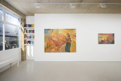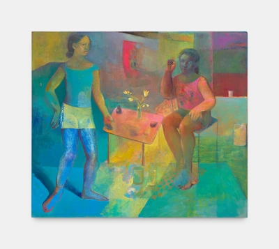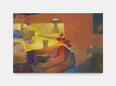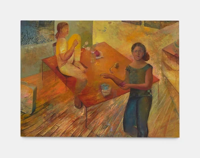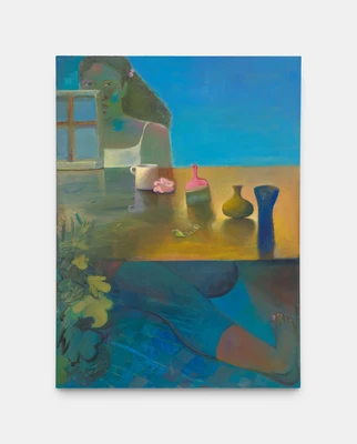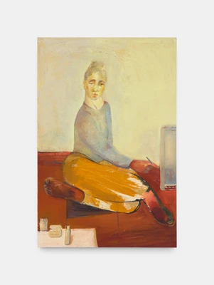 One of the most striking aspects of Dudley’s recent series are the studio portraits. In The Painter, for instance, the most consequential formal decision happens below the waist: the crossed, folded legs are rendered as a single flattened mass in raw ochre and yellow—not so much a description of anatomy as a compressed ellipse, with a long diagonal slash of near-white cutting across the yellow ground and a dark line looping beneath like a dropped cord. It recalls the biomorphic compressions of Willem De Kooning’s late-1930s figure studies, where pelvis merges with thigh and the body becomes its own environment—though where De Kooning’s forms torque restlessly against one another, Dudley’s oblong sits with a stolid composure closer in spirit to Luc Tuymans, who reduces the body to its most economical silhouette and lets that economy do the unsettling. The contrast with everything above the waist is what gives the picture its particular charge: the torso and face are thinly painted, barely resolved, the grey-blue top dissolving into the cream wall behind it, so that all the pictorial weight has pooled in that wedge of ochre—gravity and paint finding the same place to rest.