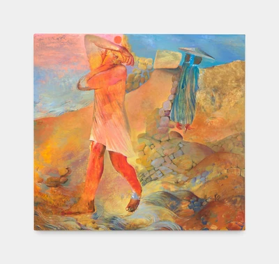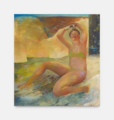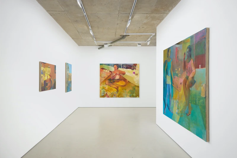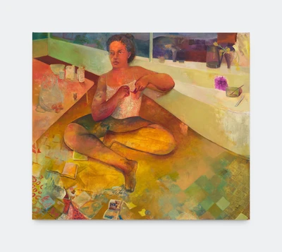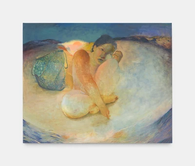 ‘Dudley’s approach to the fantasy aspect of her imagery has not calcified’, reflected John Yau, the poet who has spent a critical lifetime considering the mark-making of the Figurative Expressionists, ‘making everything in her art feel discovered.’ This feels true in the way that Balthus’ stage-set street-scenes do, or even the narrative frescos of Piero della Francesca, which Dudley cites as an influence on works like Overcast. Often, her figures appear to be lost in the rapture of a mute dramatic monologue, inviting the viewer in just far enough that we can see the outlines of the performance—whether the painting of a self-portrait with a mirror, or the unnaturally contorted posture of Studio Break, or the shimmering light on a pearl in a woman’s hand—while the substance of the theatre is hidden. Dudley works with oil ground and oil paint, sometimes incorporating cold wax, before using rags to wipe back the textured surface, lifting away built-up layers from earlier interventions. The effect of this reworking is to leave each image suspended between emergence and erasure, as though what we are seeing has only just come into view and is already on the verge of slipping back into the ground from which it was made.