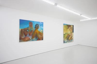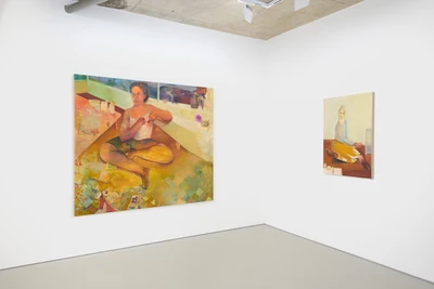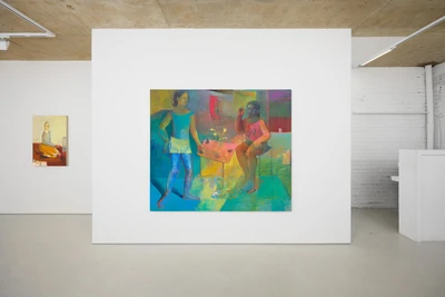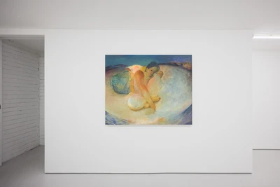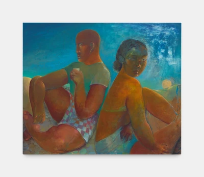 This is a useful way to approach Dudley’s paintings, which observe atmospheres of interiority in relatively private spaces. On the surface at least, very little appears to happen in them: two lovers, or perhaps platonic friends, are so at ease in one another’s company that back-to-back silent contemplation becomes the preferred method of a lazy afternoon; a woman, resembling Dudley herself, sits cross legged on the floor of her small apartment, reading a miniature red book while eating grocery-store clementines out of a plastic bag; another woman, on the beach in a pistachio-green bikini, tips sand from her exquisite white shoe with the same distracted sprezzatura of a Raphaelite saint. They are pictures of elongated pause rather than causal progression, where each scene feels self-contained yet faintly continuous with another, as if encountered just before or just after something else. The spaces they occupy operate as shifting conditions, assembled from fragments of ordinary life—or, more specifically, from that time-outside-of-time we might feel on holiday or on an idle and sunless Tuesday, when the rattle of our ordinary lives is briefly held in suspension and we are able to look at ourselves as though from elsewhere—so that nothing is held long enough to become fixed, and what remains is a quiet sense of having arrived somewhere already slipping into another place.