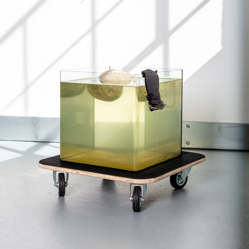 Echo’s Bones brings together new and previous works, exploring how shifts in context reshape meaning. Highlights include the Carrara marble bones from Echo’s Bones; vintage photographs reflecting intimacy and absence; and objects ranging from swordfish bills and shells to children’s teeth and found vessels. Feriancová introduces site-specific interventions, including a sketch on the gallery window and a draped fabric dress extending into the installation. Curved metal structures hold printed fabrics depicting algae and mimosa plants, while a water tank sound installation, developed in collaboration with composer Stroon, distorts sound to explore echo, vibration, and the sensory politics of perception. Other works reference literary and cultural narratives, such as Don’t Turn Back (2004-2026), which parallels The Little Mermaid through themes of voicelessness and vulnerability, and Vertebra (2022), an audio-visual project examining the intrusion of architecture into space. Newly developed works made with Victorian tiles evoke British utilitarian aesthetics, creating a dialogue between historical forms and contemporary interventions.