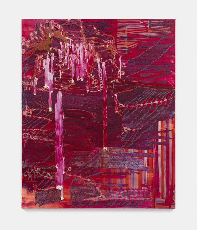 Featured in this exhibition are two works by John Hoyland (b.1934 − d.2011), a forerunner of British non-figurative art in the post-war period. Hoyland believed in the deep expressive potential of abstract art. Originally inspired by the American Abstract Expressionists, Hoyland was never content to sit still, and his later paintings sought inspiration in cultures widely dispersed in time and space. For him, art was “about making transformations” and “finding the images that lie behind emotions produced by the mind, hand, eye, memory and heart” (Hoyland, 1994). This ambition is reflected in works by the eight accompanying artists who, like Hoyland, are engaged with finding a visual language to represent complex metaphysical responses to our embodied experience of the world, as visual spectacle, physical process, or as social and political structure. In the words of Mirror City’s curator, Sam Cornish, the nine artists are “searching for meaning and pictorial intensity with definite definite if not predictable purpose” (Cornish, 2026).