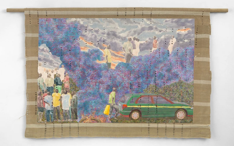 The lack of green spaces is particularly critical in Lagos, which has often been described as a ‘concrete jungle’, in no small part due to rapid urbanisation that privileges construction and expansion over public gardens. Omuku is acutely aware of socio-economic tensions birthed from flawed political systems, something that her work explores in depth. In Dream Logic, faceless people queue for fuel, sitting atop empty jerry cans, while One Particular Man depicts crowds of people gathered, as another walks to refuel his broken-down car. The subjects of both paintings are transposed from urban settings into arcadias distinguished by dense thickets of acid green shrubbery, or a panoramic cloudscape, parting thunderously to reveal streaks of sunrise. In Omuku’s hands the garden is a crucible of change, symbolic of the transformative power of faith, ritual and reverie.