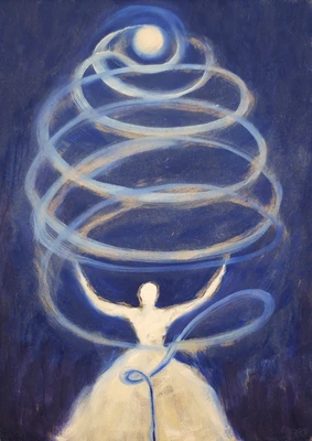 Rickman’s paintings are expressions of devotion to the landscape of west Cornwall, deeply informed by folklore, seasonal cycles and ideas of genius loci, the protective spirit of place. Attuned to the shifting rhythms of land, sea and sky, her work explores states of connection between the human and the elemental. Recurring motifs of sun, moon, stones, sea and stars guide her compositions, creating immersive works that invite viewers to sense the particular spirit and atmosphere of Penwith.