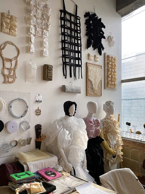 Working across textile sculpture and installation, Thiems creates soft structures that hover between utility and excess, tenderness and restraint; objects that appear to have devised their own coping mechanisms. The works feel simultaneously over-prepared and yielding, suspended between protection and exposure.