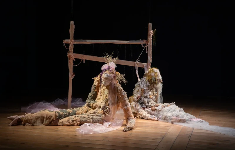 In Gabriel Kidd’s first institutional solo show, they have created an immersive work of figurative and sound pieces inspired by local folktale, landscape, erosion, and medieval notions of time. Naturally dyed silk (with weeds, wayside trees or healing herbs), whittled pine arrows, poured/cast latex skin and eggs, and Kozo paper architectural forms are painstakingly crafted and stitched together with mass produced sequins or acrylic nails. In a series of vignettes, emotionally suggestive human forms appear in the ruined remains of a hilltop domestic dwelling.