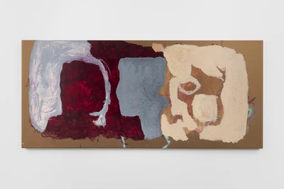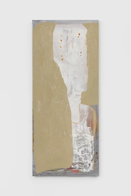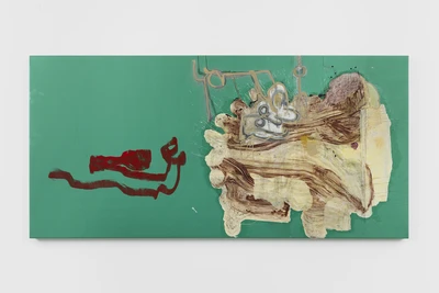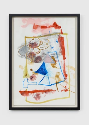 Rather than pursuing a formal fine arts education, she studied philosophy, history, and art history in Cologne, developing her approach through close engagement with peers including Michael Krebber, Cosima von Bonin, Jutta Koether, and Diedrich Diederichsen.1 Language has remained central to her practice throughout and written material occasionally appears directly on the surfaces of her paintings.