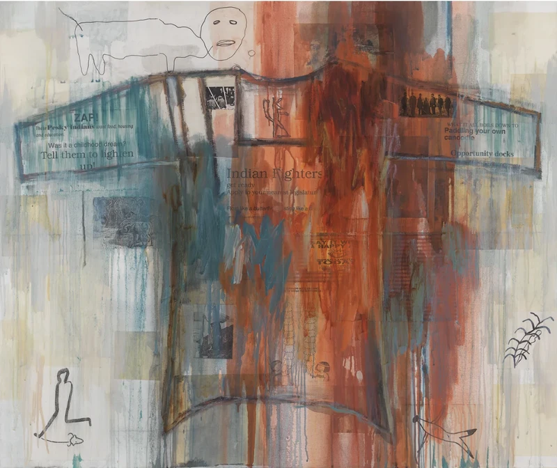 Both Jaune Quick-to-See Smith and James Luna advocate for Indigenous American communities throughout their work, bringing activism and education into their practices and critiquing the fetishisation and objectification of their cultures. A citizen of the Confederated Salish and Kootenai Tribes, in her I See Red series Smith harnesses the colour red as a symbol of anger, while also referencing the pejorative nomenclature ‘red Indian’ applied by settlers in North America in the late 18th century to those forcibly displaced by land seizure. Both I See Red: Fry Bread (1995) and I See Red: Indian Fighters (1998) feature a single image traditionally associated with Native American life outlined thickly in black, presented within a field of news clippings, advertisements and gesturally applied paint, redolent of the visual languages of postmodernists such as Robert Rauschenberg and Jasper Johns. In her engagement with the canon of 20th century American art, Smith re-centres Indigenous culture, honouring its histories while exposing prevailing stereotypes.