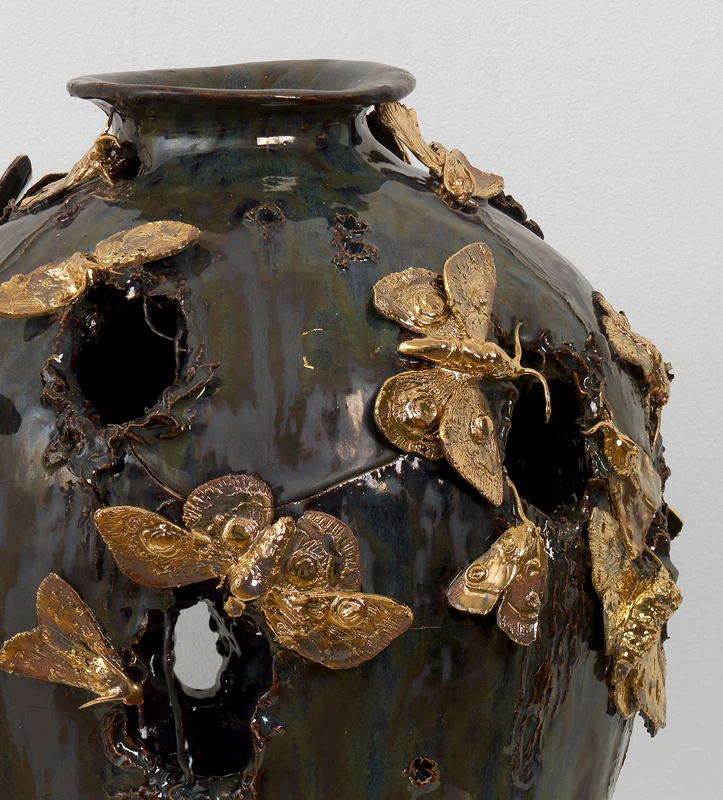 In this work, gilded moths feast on the lustrous vessel and its plush hand-knitted surroundings, nibbling holes in fabric and fraying the edges of clay. Throughout Mendick's practice, insects such as cockroaches, caterpillars, and moths proliferate, acting as symbols of infestation and bodily unease. She evokes the sensation of something internal gradually eating away at the body, whether it be grief, anxiety, memory, or desire. Through this interplay of the seductive and the abject, By A Thread explores vulnerability, beauty, and destruction as simultaneous truths.
